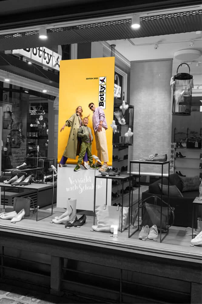 Seit über 30 Jahren begleiten wir unseren langjährigen Kunden Botty auf seinem erfolgreichen Weg. Von Anfang an haben wir gemeinsam an der Entwicklung einer unverkennbaren Markenidentität für das regionale Schuhfachgeschäft gearbeitet, die heute weit über die Grenzen der Region hinaus bekannt ist. Als kreative Schmiede für das gesamte Markengesicht von Botty kümmerten wir uns um alle Aspekte – vom Ambiente am Verkaufspunkt über sämtliche Kundenwerbemittel und Öffentlichkeits-Werbemittel bis hin zu den Webtexten und Social-Media-Aktivitäten. Unser Ziel: Ein stimmiges Erscheinungsbild, das die Werte und den Charakter des Schuhfachgeschäfts widerspiegelt.