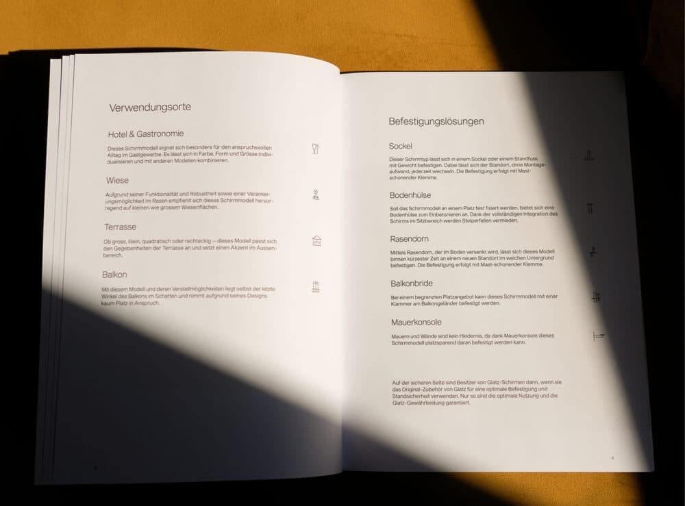 Der Sonnenschirmhersteller GLATZ stellt alle Mitbewerber in den Schatten, wenn es um technisch ausgereifte, modern designte Qualitätssonnenschirme geht. Damit dieser hohe Anspruch auf Augenhöhe mit dem heutigen Zeitgeist zum Ausdruck kommt, hat die Schweizer Traditionsmarke einen Relaunch angestrebt. Dabei haben wir die Marke unterstützt und ihre Werte im Rahmen der Neupositionierung in eine neue Sprache übersetzt.