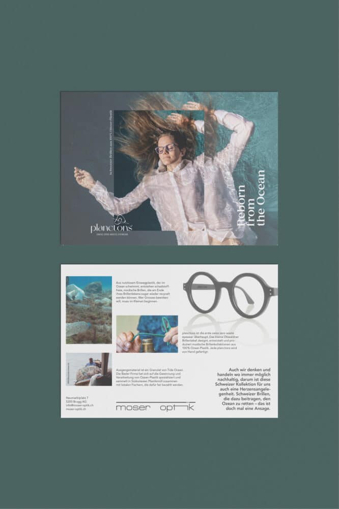 planctons heisst die erste swiss zero waste eyewear überhaupt. Sie wurde im Jahr 2021 gegründet. Das agile Startup Unternehmen designt, entwickelt, produziert und vertreibt Brillen aus 100 % Ozean Plastik für den nachhaltig orientierten Modemarkt in der Schweiz und weltweit. Aus Einwegplastik, der in den Weltmeeren schwimmt, werden nachhaltige Brillen gefertigt, die am Ende ihres Brillenlebens sogar wieder recycelt werden können. Die Plastikgewinnung und die Aufbereitung zu Granulat laufen über das Schweizer Start-up-Unternehmen Tide Ocean in Basel. planctons sind ausschliesslich in Augenoptik-Fachgeschäften erhältlich, deren Denken und Handeln zu den Werten der jungen Schweizer Marke passt. Das Naming, das Branding und alle digitalen und analogen Kommunikations-Massnahmen stammen aus der tomcat-Küche. planctons ist ein Paradebeispiel für erfolgreiche Markenarbeit mit höchster Budget-Sensibilität.