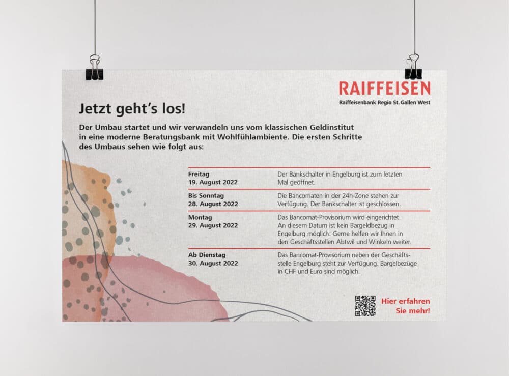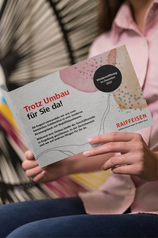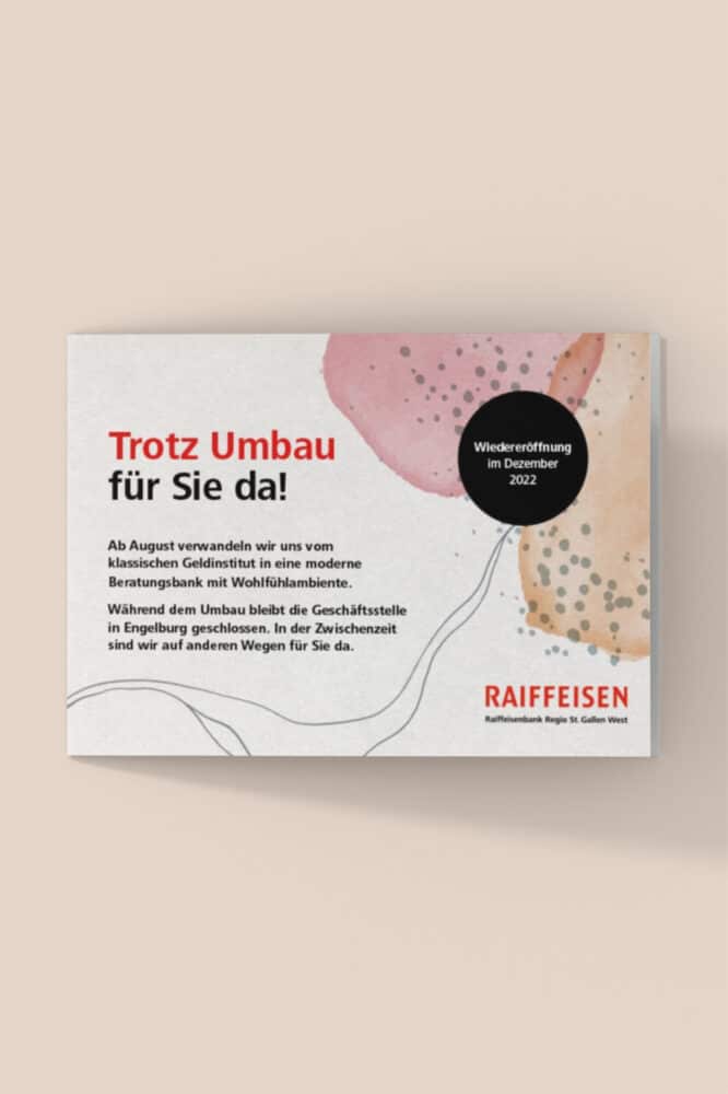 Bei diesem Projekt drehte sich alles um die Umbaukommunikation der Raiffeisenbank Engelburg und ihrer Verwandlung von einem klassischen Finanzinstitut zu einer modernen, persönlichen Beraterbank. Der Wandel manifestierte sich durch eine Neugestaltung der Bankräumlichkeiten, die der persönlichen Beratung mehr Raum gewährte, sowie die Einführung von Automaten, die fortan den Zahlungsverkehr abwickelten. Bei der kommunikativen Begleitung dieser Umstellung war Fingerspitzengefühl gefragt, da sie weit über die übliche Informationsvermittlung hinausreichte. Die menschliche Psyche war hierbei von zentraler Bedeutung, handelte es sich doch für gewisse Kundinnen und Kunden um eine grosse Veränderung. Durch eine emotionale, klare, authentische und argumentative Kommunikation vermittelten wir die Botschaft: «Im Dorf haben wir nun eine moderne Bank.»